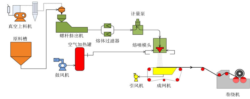 真空吸料上料機用高壓風機自動吸入聚丙烯然后送至螺桿擠出機,擠出機加熱熔化PP顆粒至液態(tài)。高壓風機或空氣壓縮機和儲氣罐壓縮空氣送至空氣加熱罐加熱,熱空氣通過壓力使熔化成液態(tài)的聚丙烯材料從噴頭噴射而出形成絲狀物因為噴頭內含數(shù)以百計很的小孔,后噴出的絲狀物可以水平到達成網(wǎng)機,然后再到達卷繞設備上的。